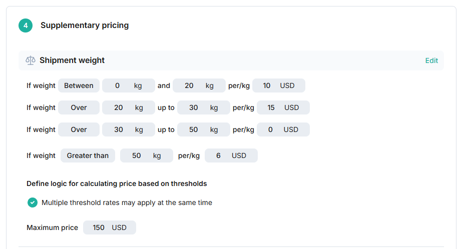 If the “Multiple threshold rates” option is selected then the system will apply the 10 USD rate to the first 20 kg of the shipment and the 15 USD rate to the final 5kg.